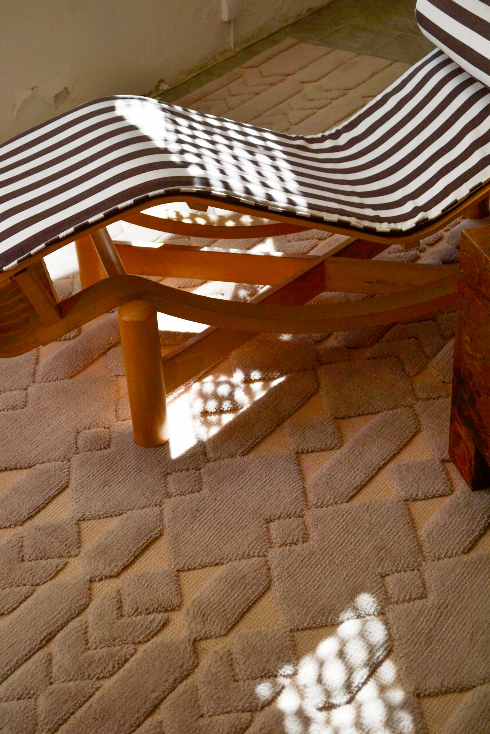 J’ai imaginé le motif en m’inspirant du mouvement continu des vagues, qui berce, invitant au prélassement et accompagnant le corps et l’esprit du repos au rêve. La structure ajourée du tissage alternant des pleins et des vides, et le motif entrelacé qui se répète sur toute la surface tissée créent des jeux de lumières poétiques et délicats.