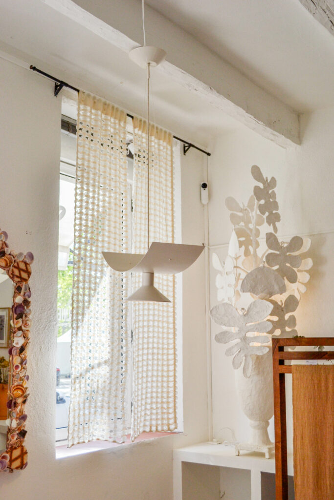 La lumière du soleil qui traverse les tissages transforme les volutes de cordes tissées en ombres dansantes sur le sol et les murs. La composition tissée est alors perceptible aussi dans l’ombre qu’elle projette, évoquant le filet de